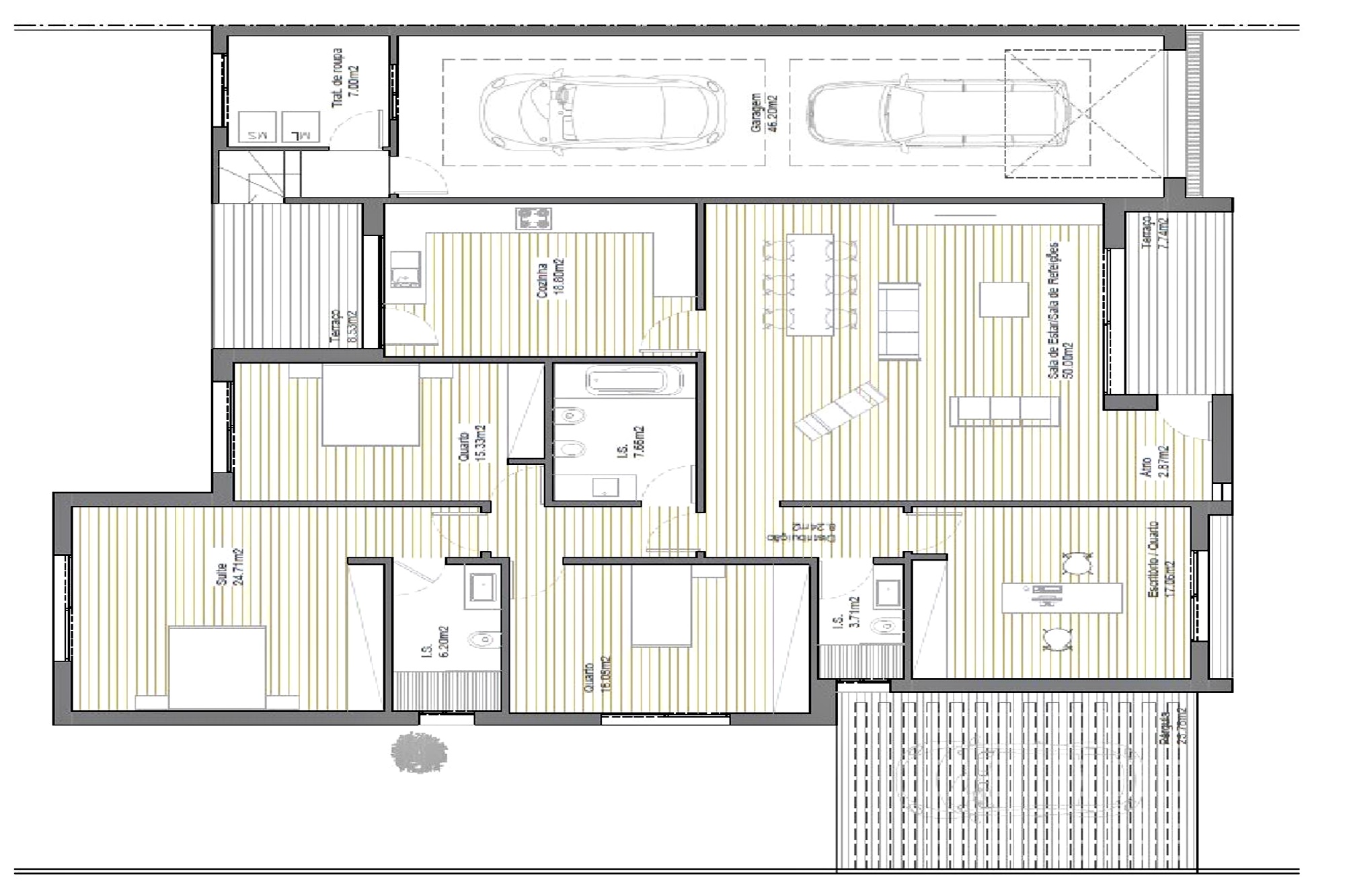 Com uma área bruta de construção de 250 m², cada moradia convida a uma vida tranquila, sem abdicar de conforto nem de espaço. No exterior, o acesso é feito por um logradouro amplo, com lugar para mais dois carros além da garagem fechada para dois veículos. Há ainda dois lugares de estacionamento em frente a cada moradia.